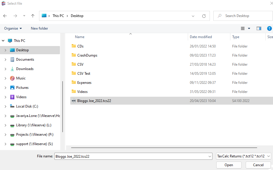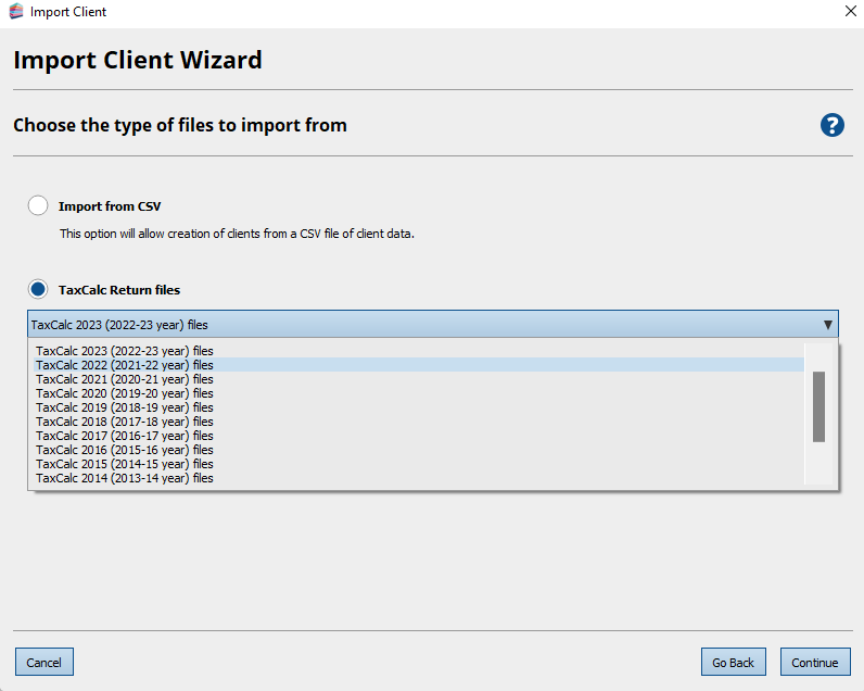 TaxCalc can import data from previous tax years (for example TaxCalc 2022) from the tax return files so that you don't need to enter the same information for 2023 onwards. When you import a client using a tax return file, you're doing two things: