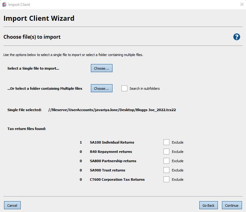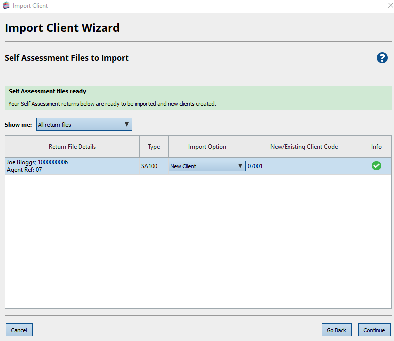 Click on Open. This will return you to the Import Client Wizard. The file path to your selected file is now displayed and the return file details are now populated (in this case with a single SA100 return).