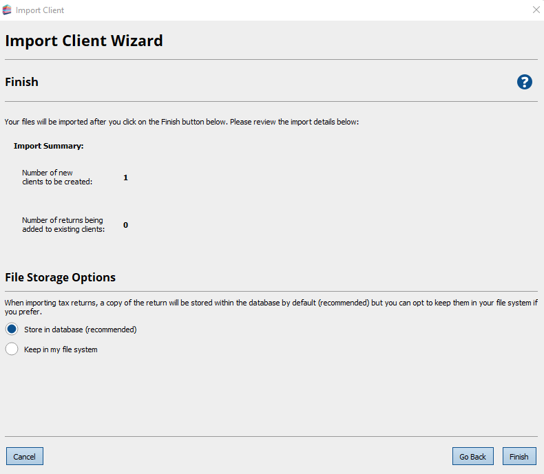 Click on Finish. The imported client has now been added to the client database and will appear in any list of clients.