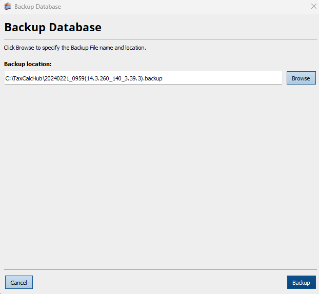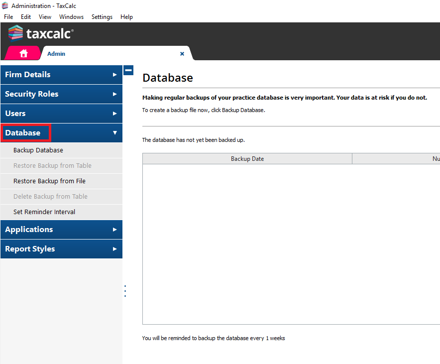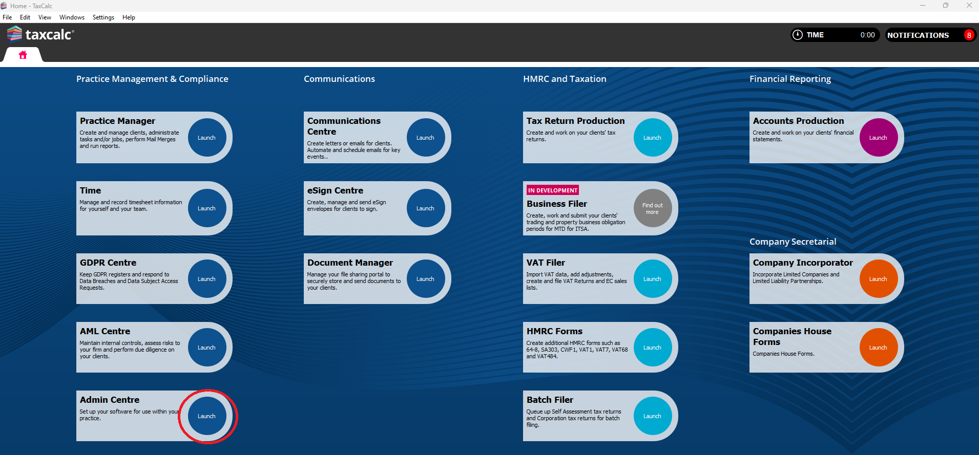 TaxCalc uses a database to store client, accounts and tax return data. This SimpleStep guide will help you to take regular backups. If you run TaxCalc on a network, you must perform the backup on your server. You can't run a backup remotely from a computer that's connected to the server. If you are using TaxCalc's CloudConnect you can take a backup following the steps below, with the exception that you cannot define the location. CloudConnect backup locations are pre-defined to be stored on the CloudConnect servers and this cannot be changed. Step 1: Log into TaxCalc as the hub admin userOpen TaxCalc and log in with your user account details. Step 2: Open Admin CentreLaunch Admin from the home screen.