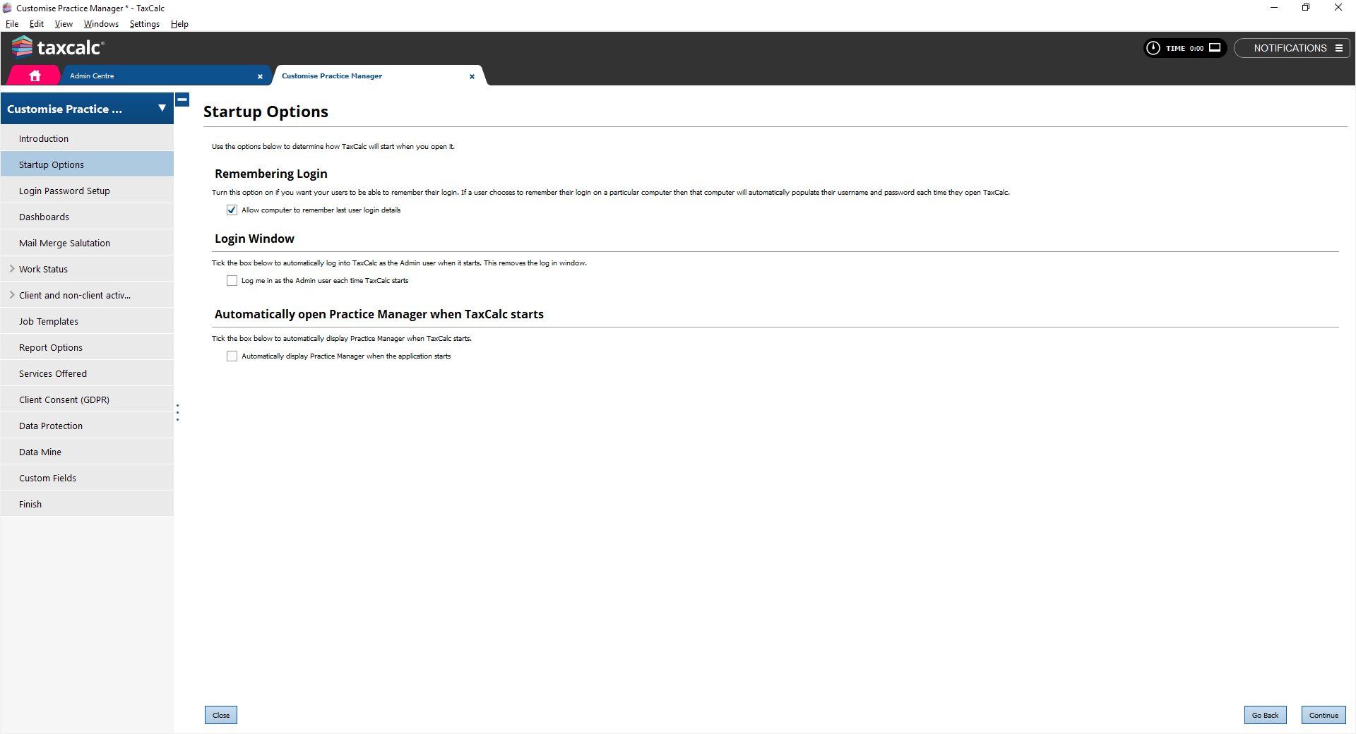 However, if you're a single user and don't need multiple logins or this added security measure, you can set TaxCalc to automatically log in for you. You can also set TaxCalc to automatically open Practice Manager tab whenever you log in.