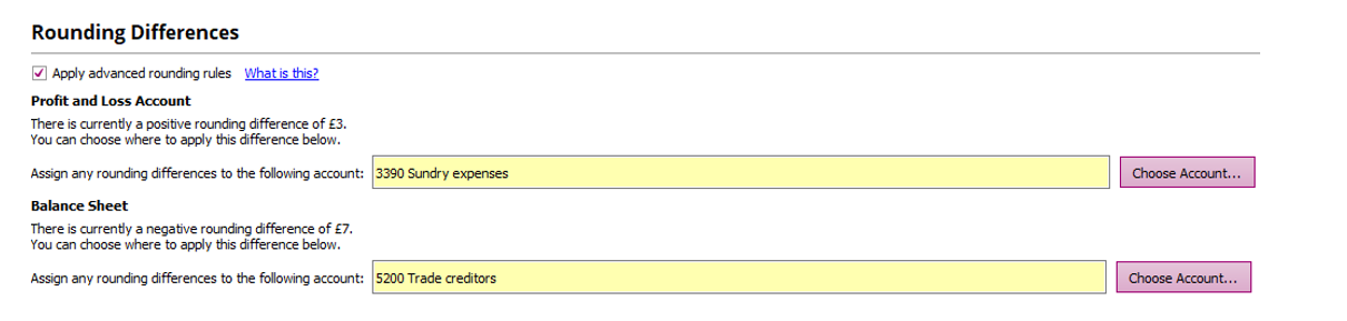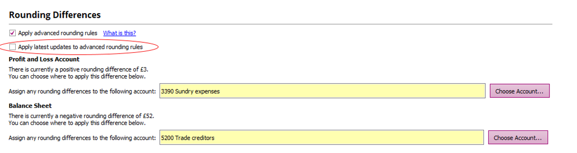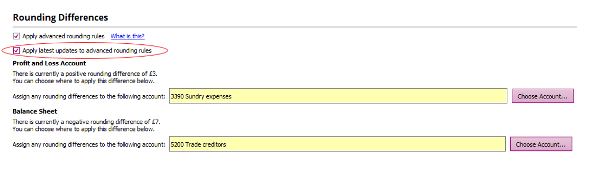 If the Apply latest updates to advanced rounding rules checkbox is ticked (enabled) and the accounting period is subsequently closed, the next time the accounting period is opened the latest rounding updates will be applied and the Apply latest updates to advanced rounding rules checkbox will not appear.
