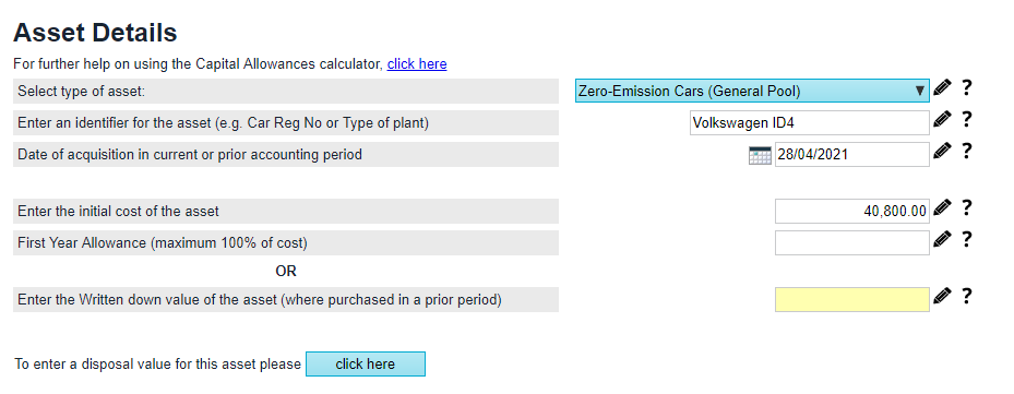 - Click on click here under 'To enter a disposal value for this asset please' to input the details relating to the disposal