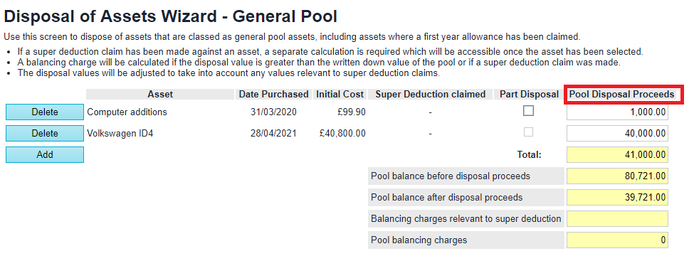 CT600: How do I enter a balancing charge/allowance on disposal of a capital allowance asset.