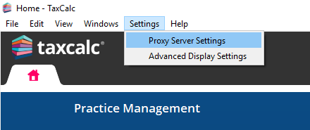 Some networks require Proxy authentication to allow external access (web), You can now configure these proxy settings within TaxCalc. At the Hub screen click Settings > Proxy Server Settings