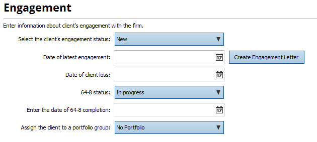 TaxCalc can automatically help you create a 64-8 and an engagement letter when you create and save a new client.