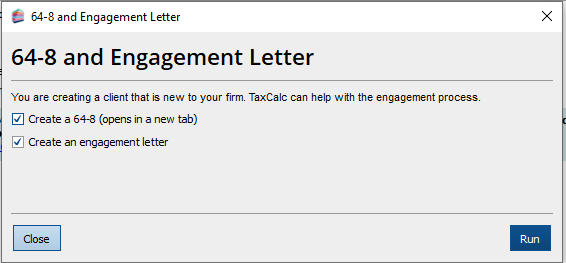 If the engagement status of the client is New (shown under the Engagement screen),then TaxCalc will ask if you want to create a 64-8 and/or an engagement letter when you save the client after clicking Finish>Finish and Save.
