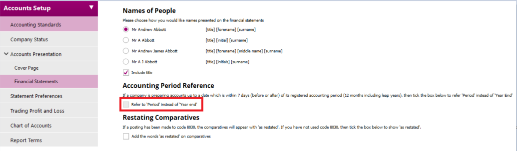 If you are generating accounts within the Accounts Production software, it will automatically apply the wording on the cover page as to whether it is a year or period end. The Companies Act 2006 states "A company's financial year ends with the last day of that period or such other date, not more than seven days before or after the end of that period, as the directors may determine." This means that if your accounts are within 358-372 days (or 359-373 for a leap year), company law states they should state year instead of period. If it is any more or less than the number of days indicated above then the accounts will be required to state period. To adjust this manually, you can open the period in Accounts Production click on Accounts Presentation > Financial Statements > Accounting Period Reference