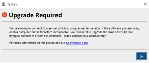 This will normally only happen if you have restored a database that was created in an earlier version of the software than the one you are currently using. If you want to keep the database you have restored, simply download the latest installer from the TaxCalc website and re-run the installer. It should upgrade the restored database to the current version and the program will run. The following Knowledge Base article Reinstalling TaxCalc in case of a failed update or other unexpected behaviour will guide you through this process. If you mistakenly restored the current database, you will need to restore the database you were using previously. Please note: TaxCalc can take no responsibility for loss of data caused by restoring an incorrect backup or failing to keep adequate backups of your data.