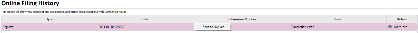 If you receive error message 9999 when trying to file to Companies House, this could be for a large number of reasons but is usually due to an issue with the content of the accounts. We may be able to resolve your query quicker if you can provide us with the failed submission details. To provide this, right-click on the failed submission and press Send to TaxCalc as shown below: