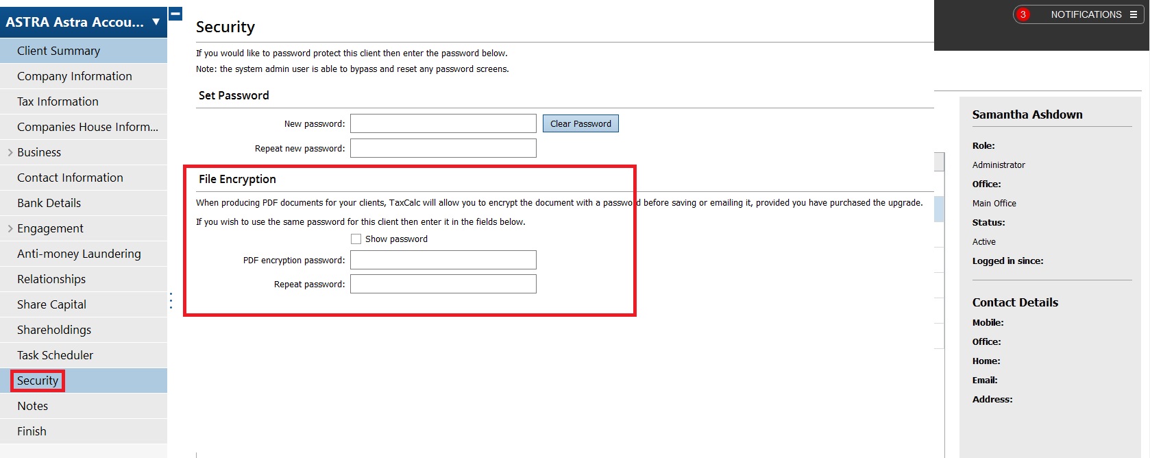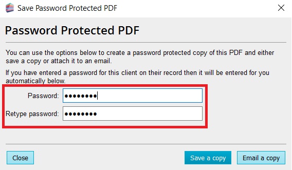 Encrypted PDF is an add-on product provided by TaxCalc, that allows a return to be saved as a PDF document and then encrypted with a password. This encrypted PDF document will not open until the correct password has been entered. As the password is hard coded into the document itself, it will be requested by any application that attempts to open the file. The password can be set in two places: Practice ManagerBy setting a password within Practice Manager, the password will be used globally for all PDF documents that you create for this client.