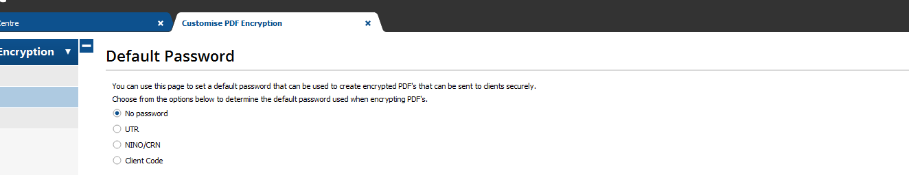 Either of these methods will allow you to encrypt the PDF with a password. This PDF document cannot be opened until the correct password has been entered. Setting a Default Password Generically It is possible to set a default password type that can be used to generate encrypted PDF's. This can be done by going to Admin Centre > Applications > PDF Encryption > Customise PDF Encryption > Default Password The default Password can range from either UTR, NINO /CRN, or Client Code. Alternatively the No Password option can be set.