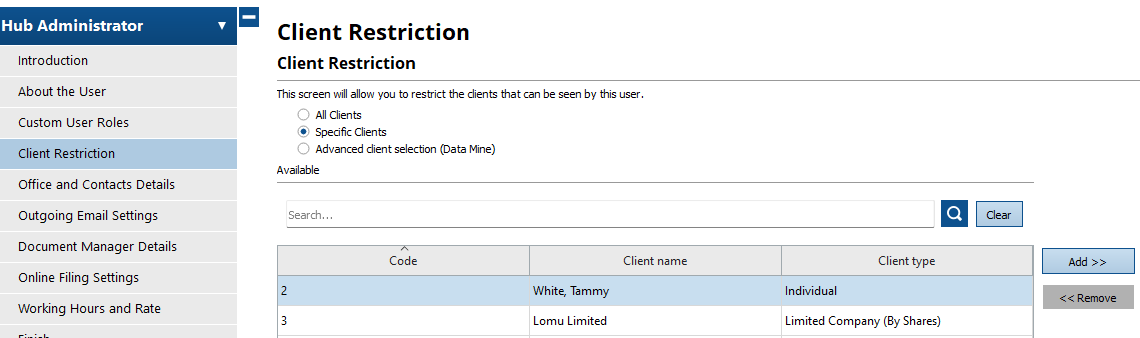 Please note: By default, all users will be able to see all clients in the database. Users that have restricted access will only be able to see the clients that have been assigned to them. Other clients will be hidden and not show on the Practice Manager screen for that user. The settings through the Administration section can be changed at any time by the hub admin user in the system. There is no limit to adding client restrictions within the database for existing users.