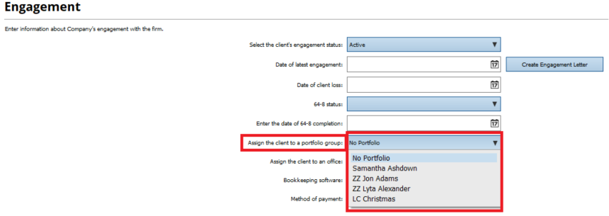 It is also possible to assign a user to a specific portfolio group within Practice Manager. This can be done by going to Practice Manager > Select a client > Edit Existing Client > Engagement. If you need help creating a portfolio group see How do I create a client portfolio?