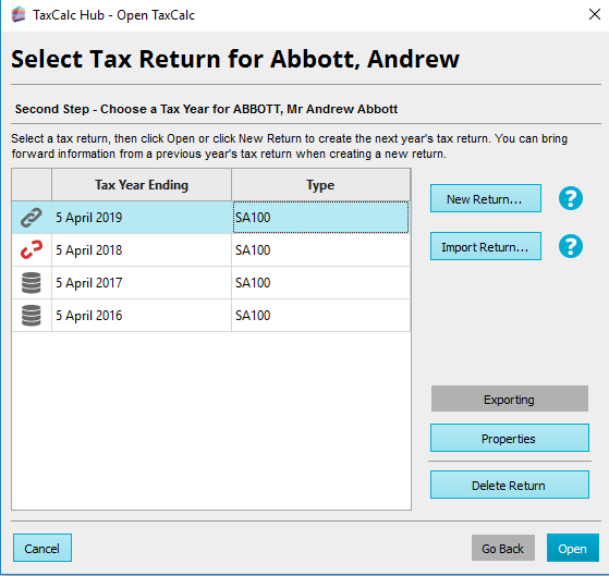 TaxCalc defaults the tax returns to be stored in the central database. If you’re using a standalone or network version, you have the option to store your returns either in a local database or in regular files. We do not recommend this as it may cause potential duplication of data, particularly if running a network version. To import any returns not saved in your database complete the following steps: