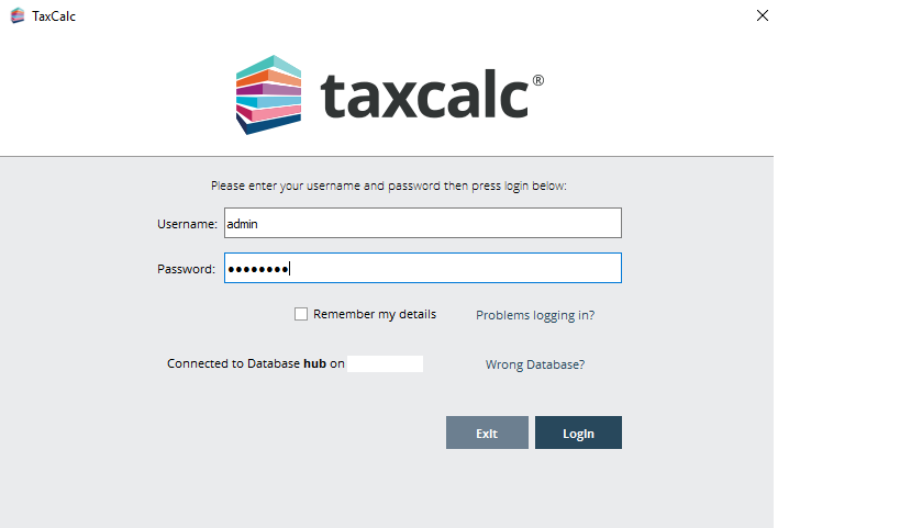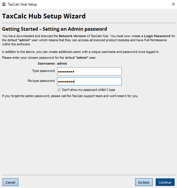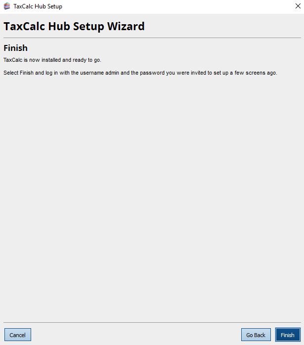 The TaxCalc Hub Setup Wizard is now complete. You will be shown the login box. Enter the admin password and then click login.