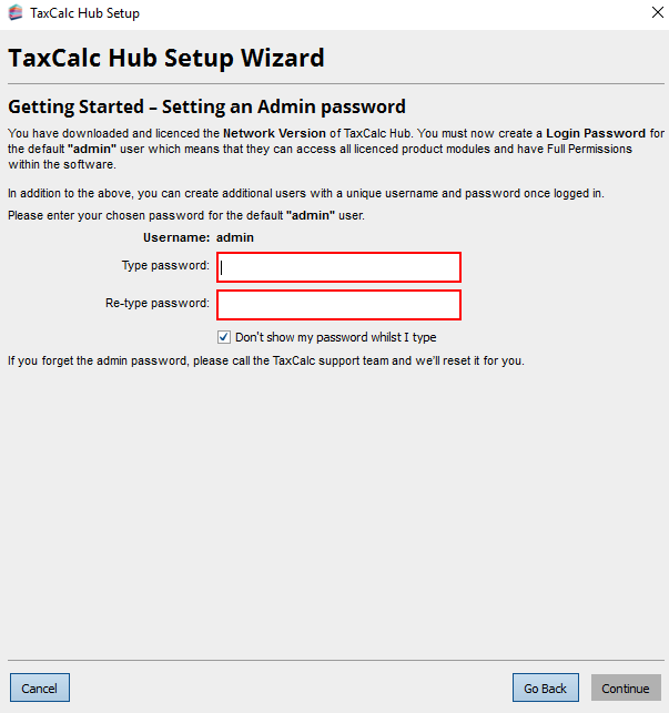 Set an admin password. This is in effect the superuser for TaxCalc; users should not need to know this password, only admins and IT staff should need it. Please note: During the setup any red bounded boxes have to be filled in before continuing. Also, standalone users will not see the following screen, they will simply be asked if they want to set an admin password (if they choose not to, the program will not require any verification to open).