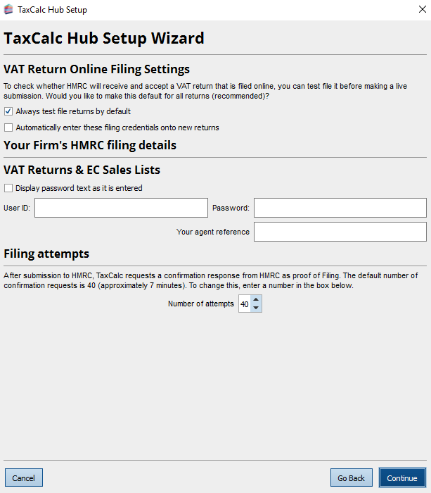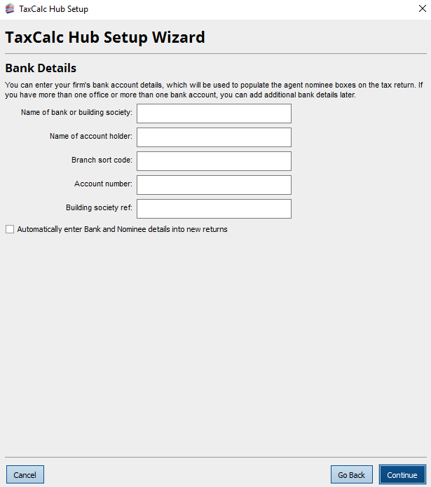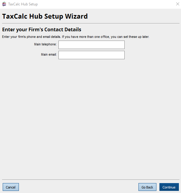 When starting TaxCalc for the first time you will be prompted to go through the TaxCalc Hub Setup Wizard. This article will walk you through this first time Wizard to ensure the program is correctly configured. You do not need to complete the information in the wizard and can simply click through it if...