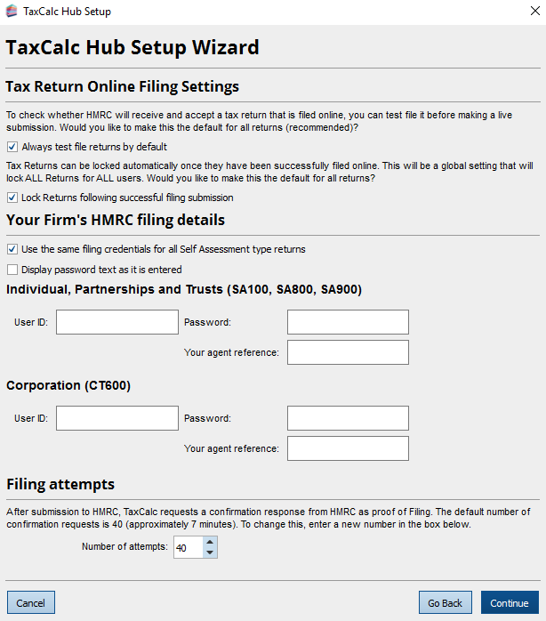 The next screen allows you to set the credentials for the different Self Assessment returns. Normally all users in a firm will use the same filing credentials. and the relevant tick box is selected by default.