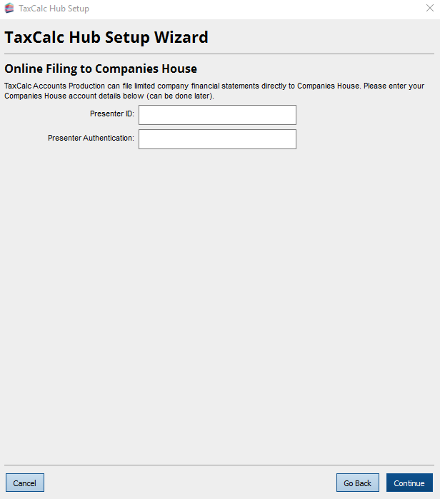You can now set up the Companies House filing credentials (if required).