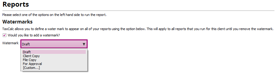 A watermark can be added or removed from a report within the Accounts Production application. The functionality is similar to that of the Tax Return feature. To add a watermark;