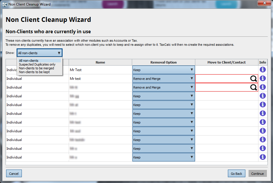 - The wizard will show you any Non-Clients it has found. Use the Show drop down menu to switch between all non-clients, suspected duplicates, non-client records to be merged and non-clients to be kept.
