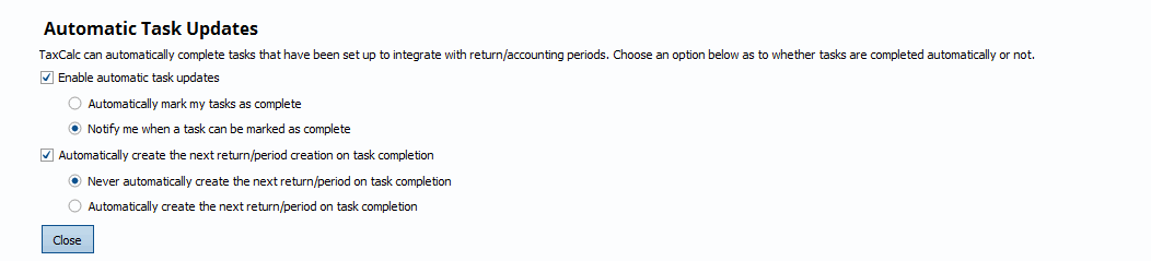 The TaxCalc software can now enable automated task functions. To enable these features, simply navigate to the following screen: