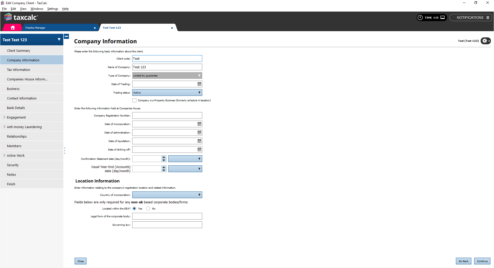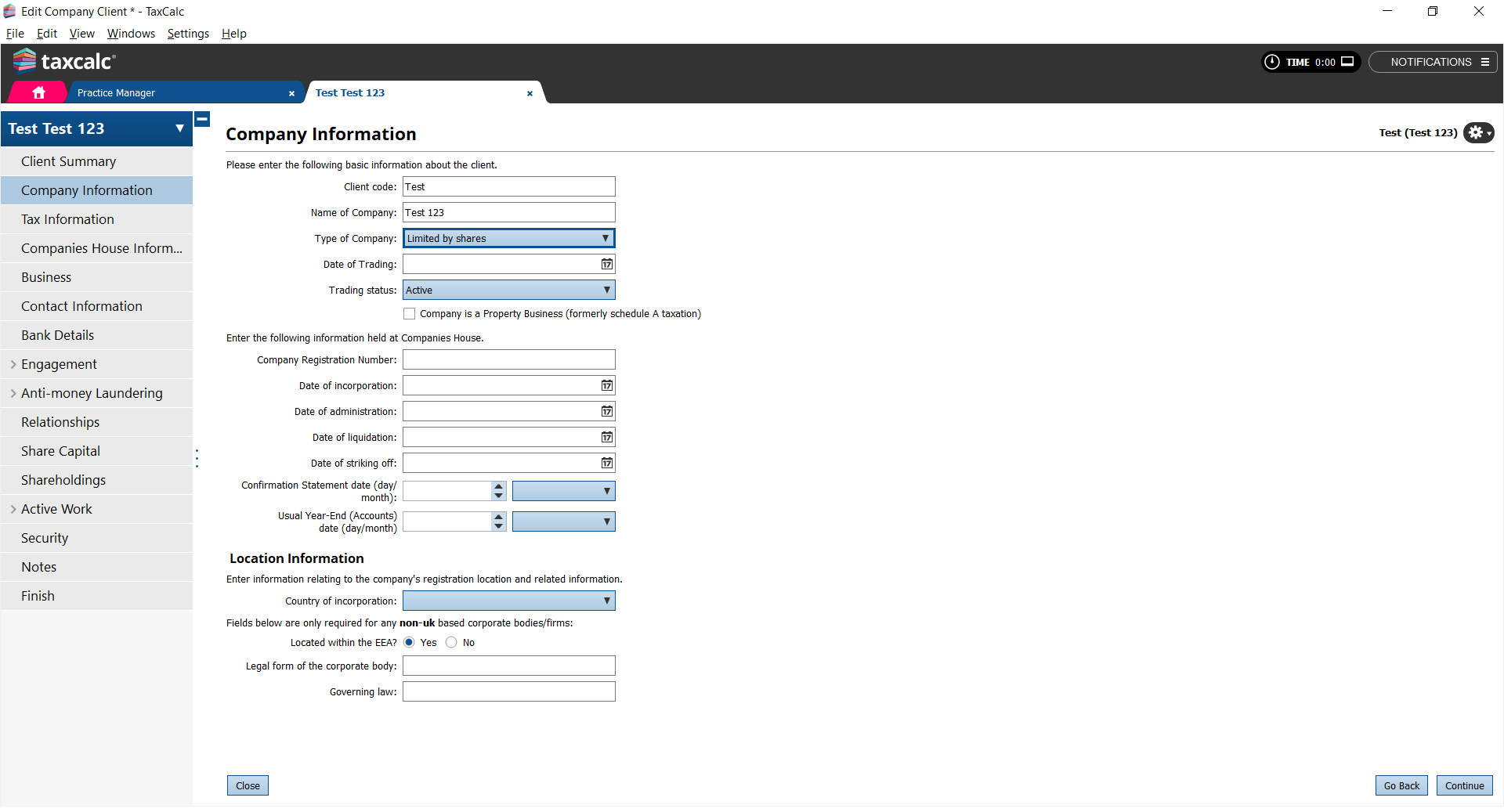10. In Practice Manager select the client again. 11. Select Edit Client/Contact. 12. Select Company Information. 13. You now have the option to change the Type of Company. 14. Select Limited by shares from the Type of Company dropdown list.