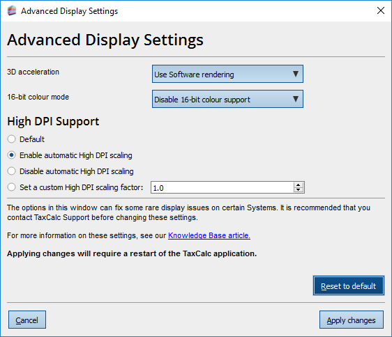 By default, TaxCalc will have applied the Enable 3D Acceleration (Preferred) option during installation. If the application is not displaying correctly (or in some cases there is blank screen), or unexpected crashing, try resetting the 3D acceleration values. If you continue to have difficulties, please attempt to select Use Angle rendering mode first and Default the HiDPI Settings. You will then need to close TaxCalc and re-open TaxCalc to now test if it is working as expected If this does not work, please re-open the Advanced Display Settings window and now attempt to select Use Software rendering from the drop down menu. You will then need to close TaxCalc and re-open TaxCalc to now test if it is working as expected 16-bit colour modeThis setting is mainly for Terminal server users who may experience display issues with a black or blank screen instead of viewing Tax returns, then users may need to select support 16-bit colour mode
