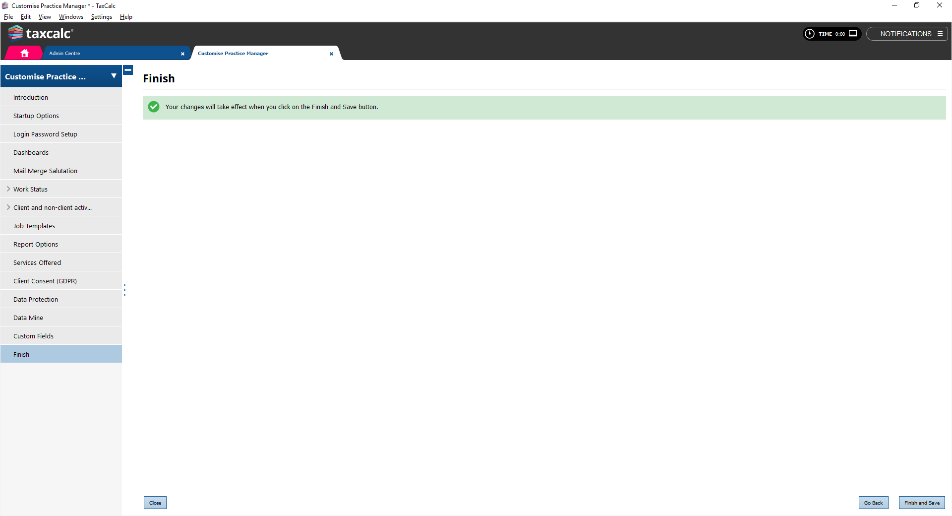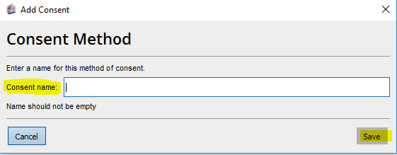 Step 4: Enter consent name > Save. Changes will apply after you click on Finish > Finish and Save > Close Admin > Re-open.