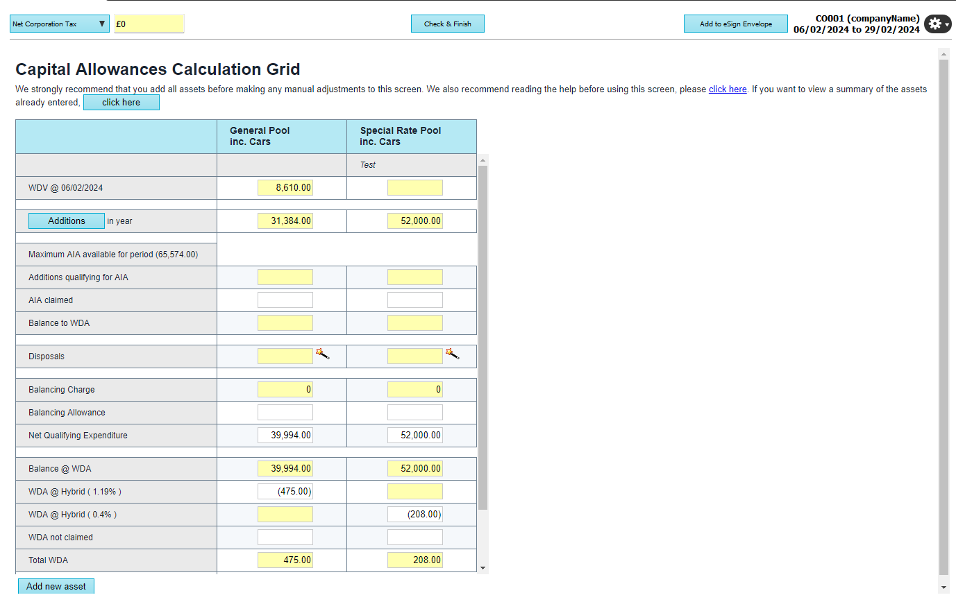 HMRC will issue the rates available for each pool based on the full tax year. If you have a scenario where a tax return is covering a period other than a tax year, you will see the term Hybrid present on the Capital Allowance Calculation Grid. This is because the application will complete the pro rata calculation based on the number of days present (which will therefore account for leap years too). A scenario to explain this further has been detailed below for your convenience. A limited company was formed on 06/02/2023 and are preparing accounts to 29/02/2024. The first limited company tax return will cover the period 06/02/2023 - 05/02/2024 and the second will cover the period 06/02/2024 - 29/02/2024. For the period 06/02/2023 - 05/02/2024, the full rates for the pools would be available as a full tax year is being covered. For the second period, the rates available would need to be pro-rated as the return only covers 24 days. If we take the General pool where the full rate available is 18%, we would take the 18% and divide this by 366 days (as this is a leap year) and multiply this by the 24 days applicable to provide the rate (rounded up to the nearest decimal place as per HMRC rules) of 1.19% Similarly for the Special Rate pool where the full rate available is 6%, we would take the 6% and divide this by 366 days (as this is a leap year) and multiply this by the 24 days applicable to provide the rate (rounded up to the nearest decimal place as per HMRC rules) of 0.4%