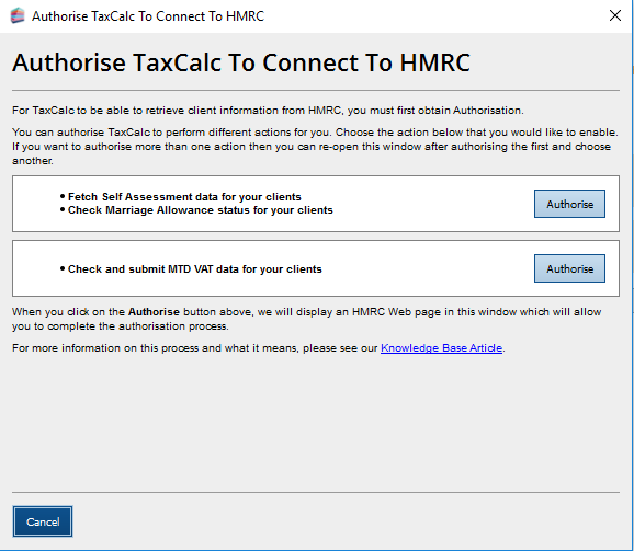 Step 1 - Authorising TaxCalc to interact with HMRC - AgentsThe first step is to authorise TaxCalc to interact with HMRC. This is a process that effectively links TaxCalc (with you as an agent) to HMRC. Please follow the steps below to authorise the software: