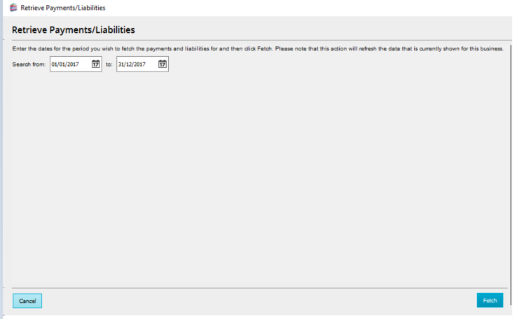 Enter the From and To date for the period you wish to retrieve the information and click Fetch. The payments that were made or refunded and any outstanding liabilities post enrolling for the MTD service will get displayed in the table on Payments & Liabilities page
