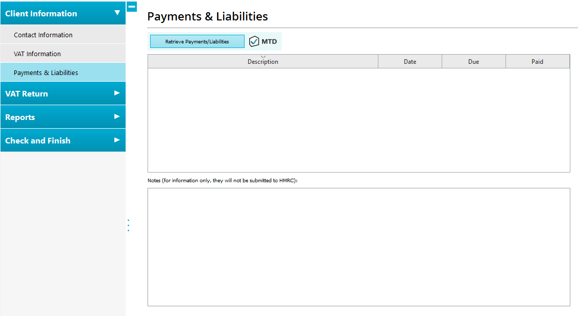 Select the VAT period with an Open status and click Open. You should now be able to complete this VAT return and file it via the MTD service. VAT periods can also be created manually before using the Fetch process but the period dates have to match the periods that HMRC hold for the business, for the period to file successfully. Once the Fetch process is completed, the periods will be validated and any mismatch with HMRC records will be shown via a message returned. Payments and Liabilities: You can also retrieve Payments and Liabilities using APIs. Go to Client Information > Payment & Liabilities