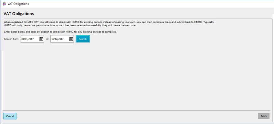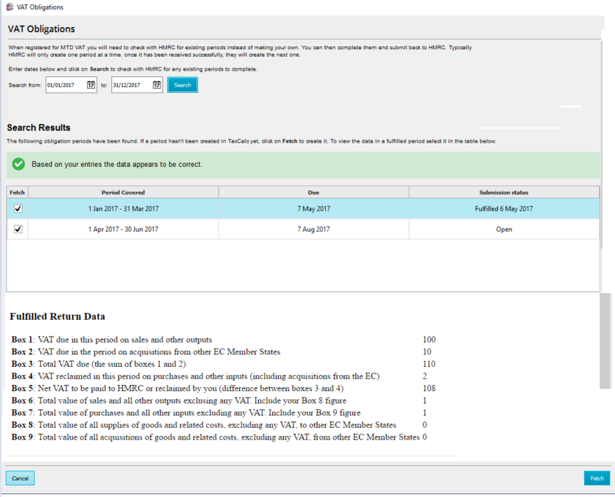 Step 2: Fetching VAT periods from HMRCOnce you have authorised TaxCalc, open VAT Filer then select the client and click the Fetch VAT Periods button The following screen will be displayed: