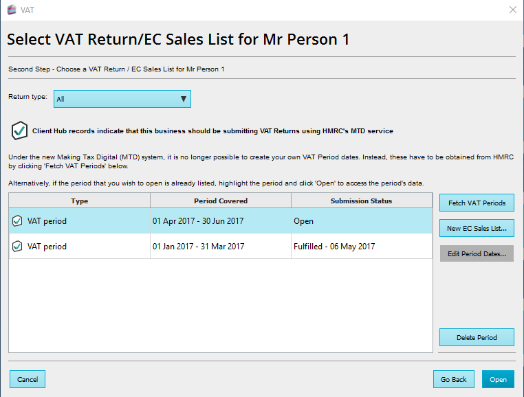 Please note: If you select a fulfilled VAT period, the VAT figures that were submitted for that VAT return period should get displayed in the area with the heading 'Fulfilled Return Data'. TaxCalc fetches the VAT figures of the fulfilled VAT return period. You can view this data by selecting that VAT return period on the Select VAT Returns/EC Sales List dialog and clicking Open. Please be aware that changes should not be made to a fulfilled VAT Return Click Fetch. You will then be taken to the Select VAT Return/EC Sales List window where you can see the VAT periods listed as shown below: