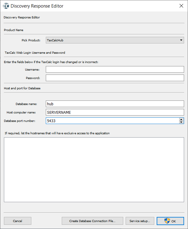 2. Is your firewall correctly configured?The next thing to check is whether the firewall is blocking the application from connecting to the server. Can you try to temporarily disable the firewall and open TaxCalc on the client machine. If disabling the firewall fixes this, firewall rules need to be added for the ports that TaxCalc uses. You may need to look at the configuration of the firewall on the server and the local machine before attempting to close and re-open TaxCalc. For more information on firewall settings, please read both of the below articles: How do I configure the firewall for the network version of TaxCalc? 3. Drag and drop connection file.As a last resort to try and force the connection, you can complete the below steps via the Database Connection File. We would however recommend avoiding this as it is a short term fix and may mean that there are bigger connection issues at the site and information from your IT consultant/expert may be required. If you have done this previously, it may be that the previous drag and drop db connection file had been fixed to the IP address instead of the name. Occasionally IP addresses can change so we would recommend using the servername instead. Can you go to the server, click on Start > Discovery Response Editor > Ensure that the details within this pop up window contains the server name instead of the IP address. a) On the server machine