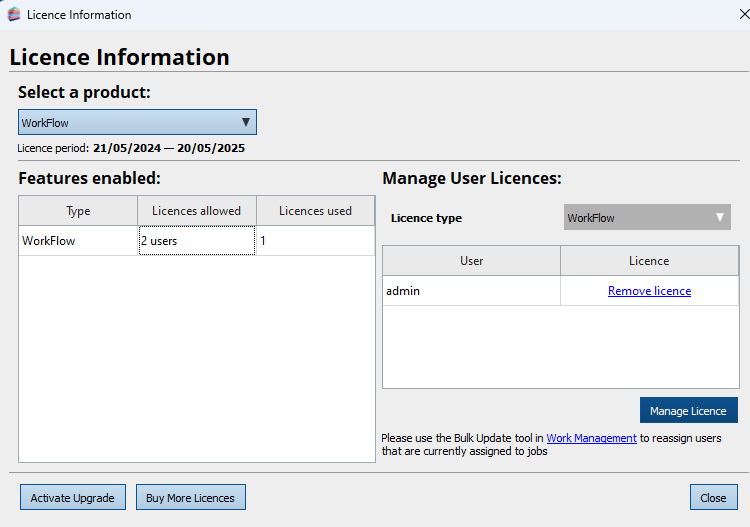 - Click Manage Licence and select the user(s) you want to access WorkFlow: