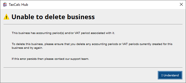 - Work items are associated against a Business record within the client itself. When going to delete a Business from the client record, if there is any work associated, you will receive the below error. Note this error message only appears in version 10.3.003 or higher. Therefore, if the Business no longer appears, the work will have been manually deleted in order to allow the system to delete the Business record.