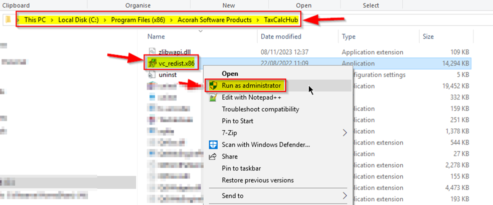 - Navigate to folder C:\Program Files (x86)\Acorah Software Products\TaxCalcHub then right click the vc_redist.x86 file and select run as administrator: