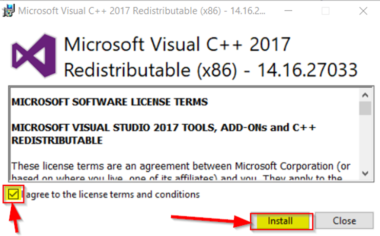 - Click Yes, then then check the box to agree to the licence terms and conditions, then click install: