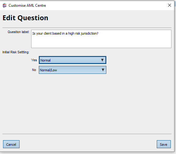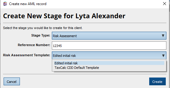 Open the Client in AML Centre and select Client Due Diligence. Create a new risk assessment (the existing one will be replaced). When you create the new record, ensure you choose the template you have created. This will then display the level of initial risks you have setup on each question.