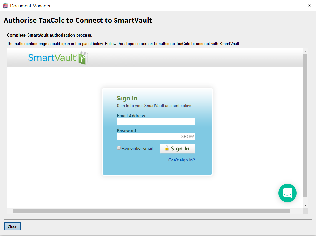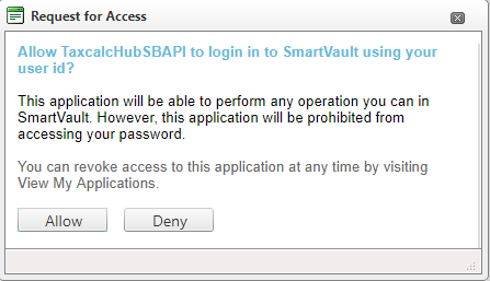 - The Authorise TaxCalc to Connect to SmartVault dialog is displayed.