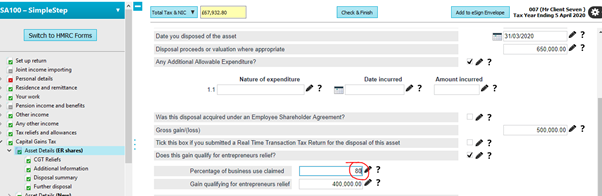 For example, if the amount calculated in step 2b. = £400,000 and the amount of qualifying gain is £500,000, the percentage will be 400,000/500,000 x 100 = 80%. Enter 80% in ‘Percentage of business use claimed’