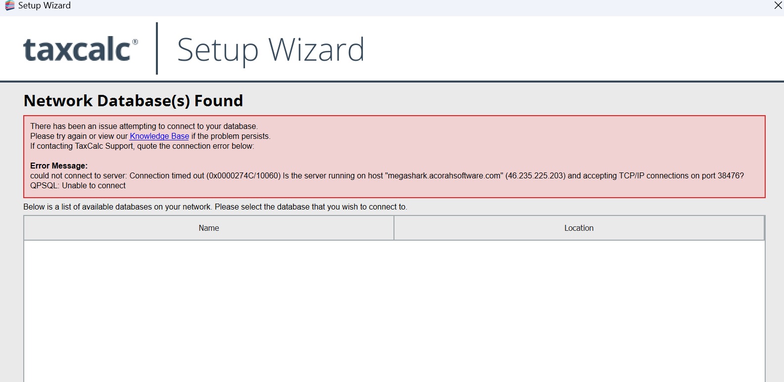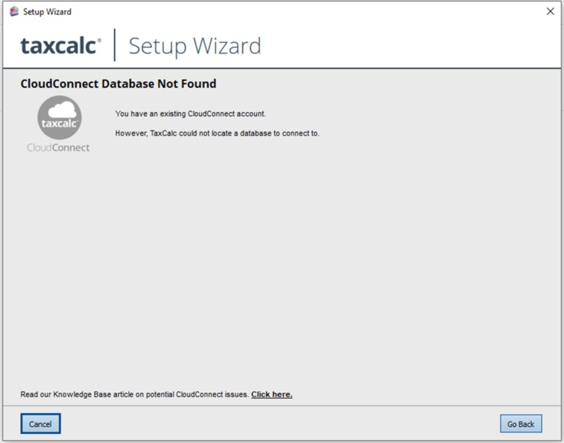 The CloudConnect version of TaxCalc uses a locally installed version of the program which then connects to the database held in the cloud. This article explains how to troubleshoot issues connecting to the Cloud database. If you are newly installing TaxCalc, you may see the below error: If you already have TaxCalc installed and something on your machine setup has changed, you may get something like the below: