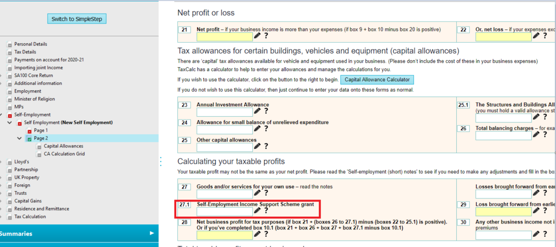 There are specific fields for entry of SEISS (Self-employment Income Support Scheme) claims. The screenshots below show where the boxes are located although please note you will need to be running TaxCalc 2021 (v11.13.079) or later to see these. Please note: SEISS has been removed from the 2023 return. SA100 – Self Employed Pages SimpleStep mode: Full Form - Your work > Self Employment > Full Form - Details > Other adjustments > Complete the box labelled Self-Employment Income Support Scheme (SEISS) grant