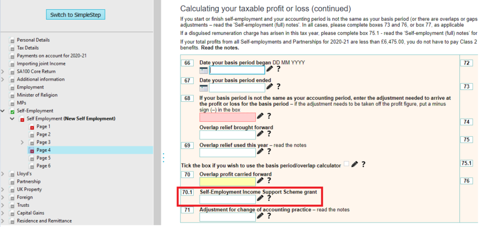In addition to entry of the amount, there is a tick box to notify HMRC that SEISS grants have been claimed. This can be found in: SimpleStep mode: Working out your tax > Coronavirus support schemes > Coronavirus Support Payments in your business(es) HMRC Forms mode: SA100 Core Return > Page 8 > box 20.1 After the June release this box will automatically be ticked after entry of an SEISS amount.