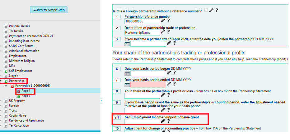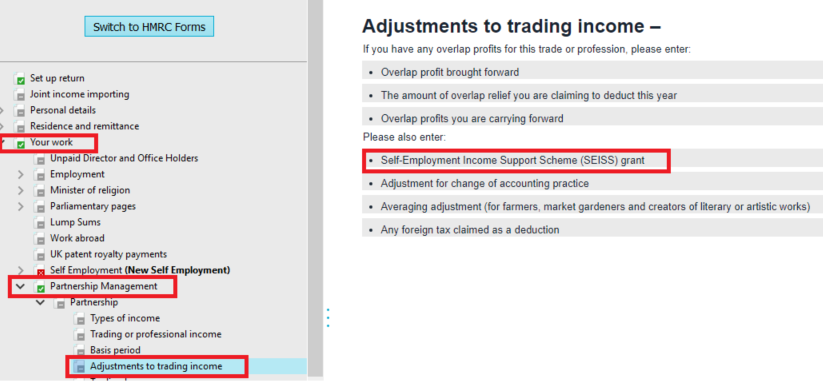 SA100 – Partnership pages SimpleStep mode: Full and Short Form Your work > Partnership Management > Partnership > Adjustments to trading income > Complete the box labelled Self-Employment Income Support Scheme (SEISS) grant