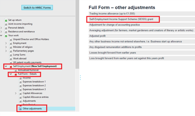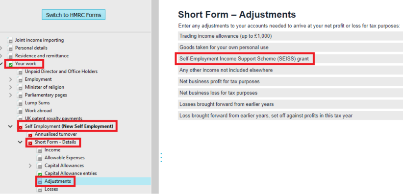 Short Form - Your work > Self Employment > Short Form - Details > Adjustments > Complete the box labelled Self-Employment Income Support Scheme (SEISS) grant