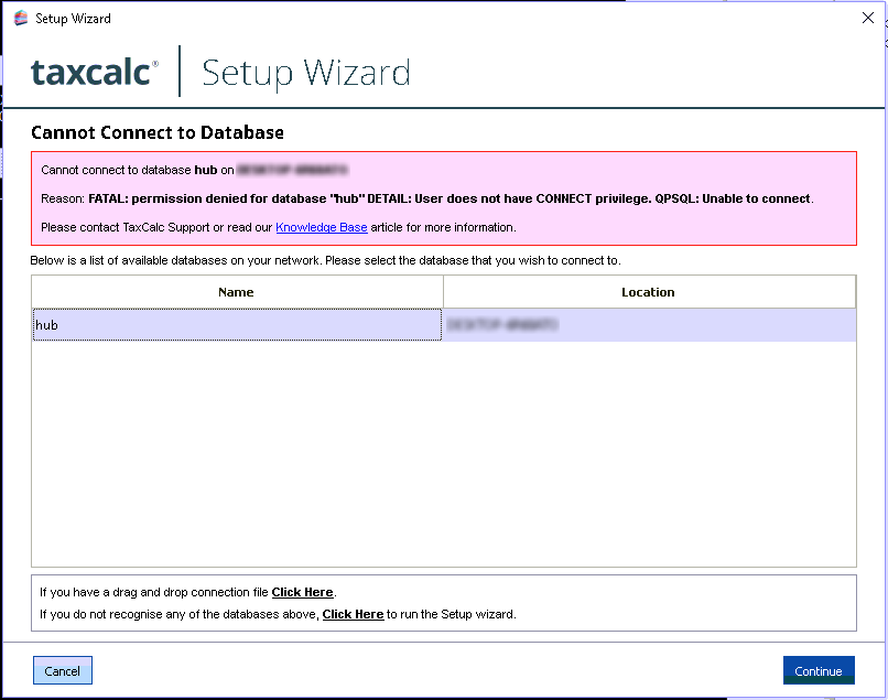 A QPSQL error may occur after a restore has been attempted in TaxCalc using a backup file that is stored or had been saved to a remote location. To resolve this issue the database needs to be removed. Then a new backup file should be created and saved to the C:\TaxCalcHub on the old server. It should then be copied into the C:\TaxCalcHub folder on the new server before attempting the restore through TaxCalc. There are two ways to remove the database.